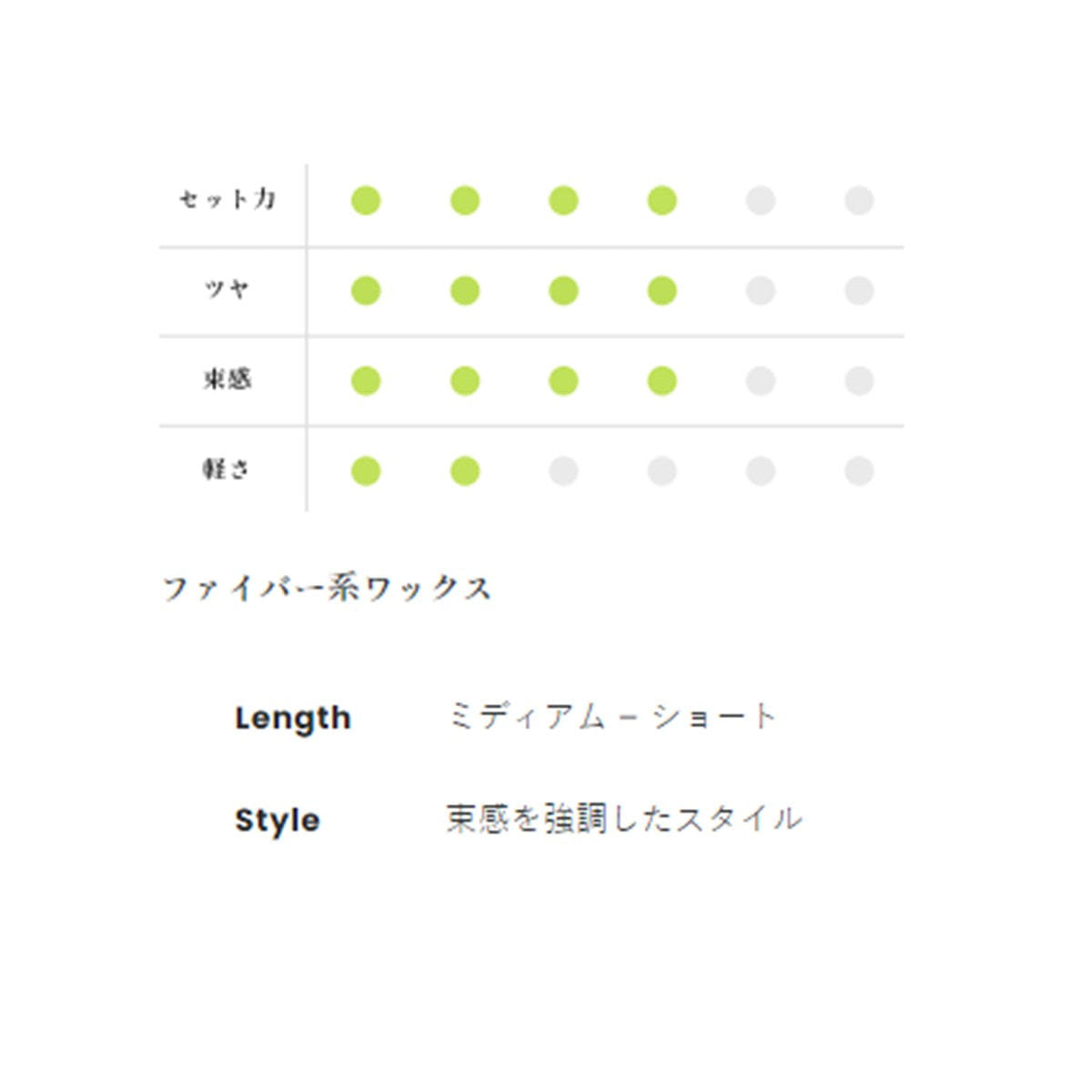 ツヤ感を生かしながら、ファイバー成分が動きや立ち上がり、束感を表現するホールド系ミディアムワックス。